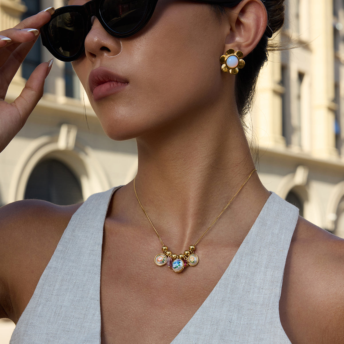 A refined gold-plated necklace featuring hand-painted floral charms and polished gold beads that add dimension and elegance. This delicate piece blends artistry and femininity, offering a timeless touch of color and sophistication. Crafted with high-quality materials, it’s perfect for elevating both everyday and special-occasion looks.