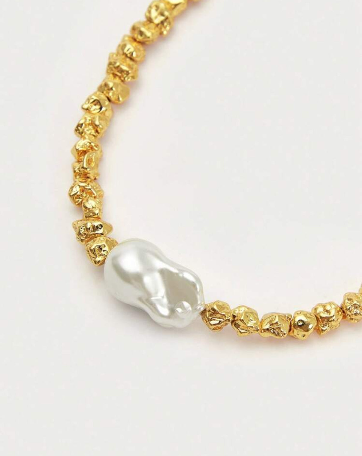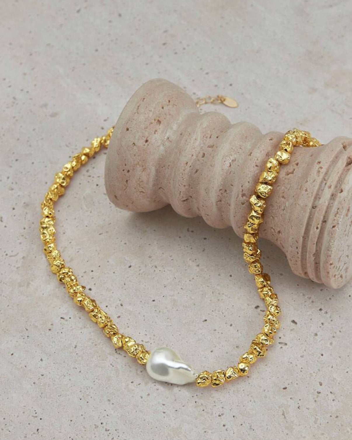 The Pearl of Purpose Necklace is a statement of elegance and meaning. Each irregular gold nugget represents life’s process — imperfect yet refined by grace — leading to the luminous centerpiece: a natural-style pearl, symbol of purity, wisdom, and divine transformation.